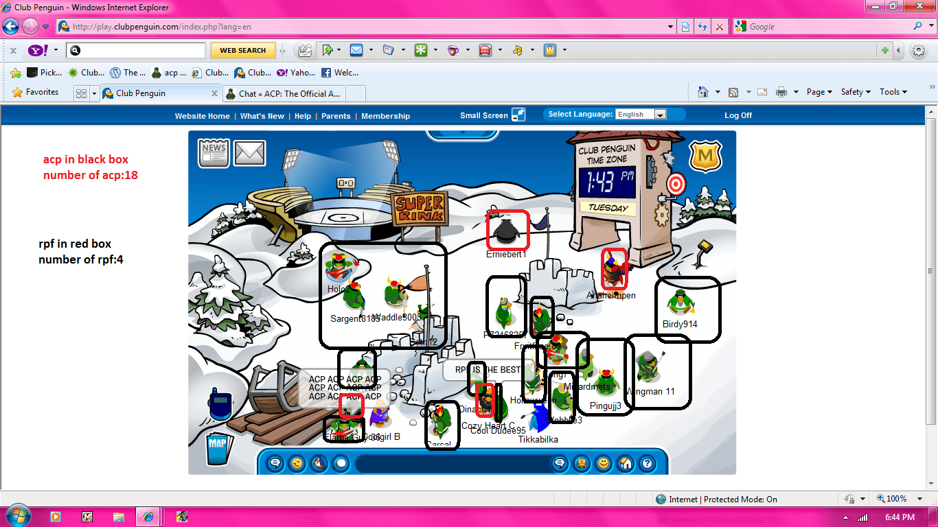 Its my 1st post on the acp site! Today as you all know we had an invasion on white out. Many acp came while only 2 little rpf came. We threw some snowballs and then just sat and did nothing because the invasion was over since it was still about 15-20 Acp vs 2 Rpf. Thank you for coming to the battle. Those of you that came are off to a good start for a promo and you would love to have one to start your summer off good. Those of you that did not come try to make it to the next one and don’t worry.