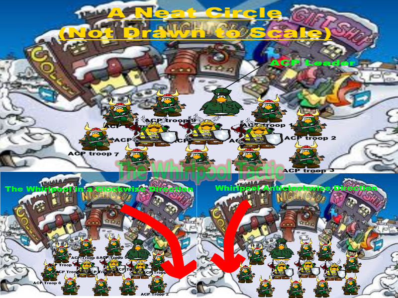 What tactic have you come up with and what room can it be used in: It is called The Whirlpool and it can be used in any room that you can make a neat circle in, mainly the Town and Snow forts. This tactic is basically an updated version of the circle. All of the penguins in the circle will move around in the circle in either a clockwise or anticlockwise direction.