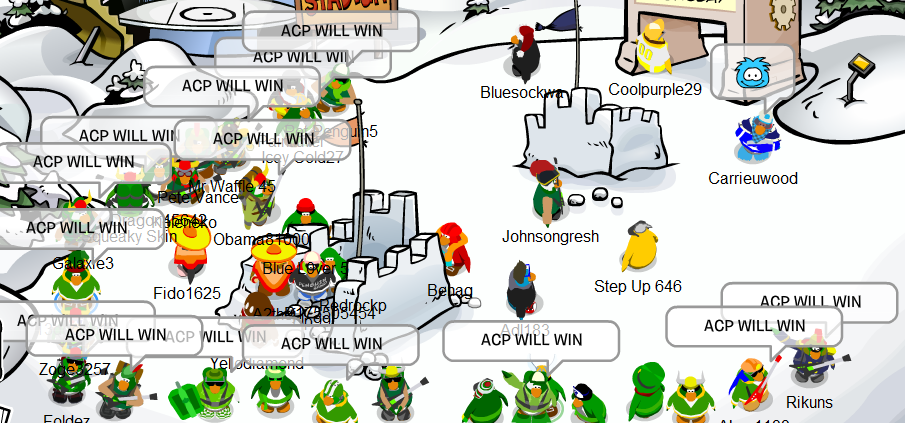 So today, we had an awesome first round of the CPACC tournament. Well awesome for us anyways. The Elites unfortunately for them did not even get a single person on Club Penguin. The ACP on the other hand got around 30+ at the Klondike, Snow Forts. Our tactics as described by CPAC itself, were impressive to say the least. We logged on before the battle and stayed at the Forts pretty much for the entire time practicing tactics while waiting for our opponents the Elites to come.