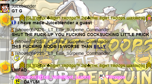 The Light Troops sure are some unfriendly people, right? Well, not only are they unfriendly, but their site isn’t suitable for children. When the LT recruit on CP and someone says “Oh, lets go to their site” they will find pictures of Penguin Rape, Dead Penguins, Multiple reference’s to the Word “Gay” aimed at ACP leaders and general swear words aimed at the ACP.