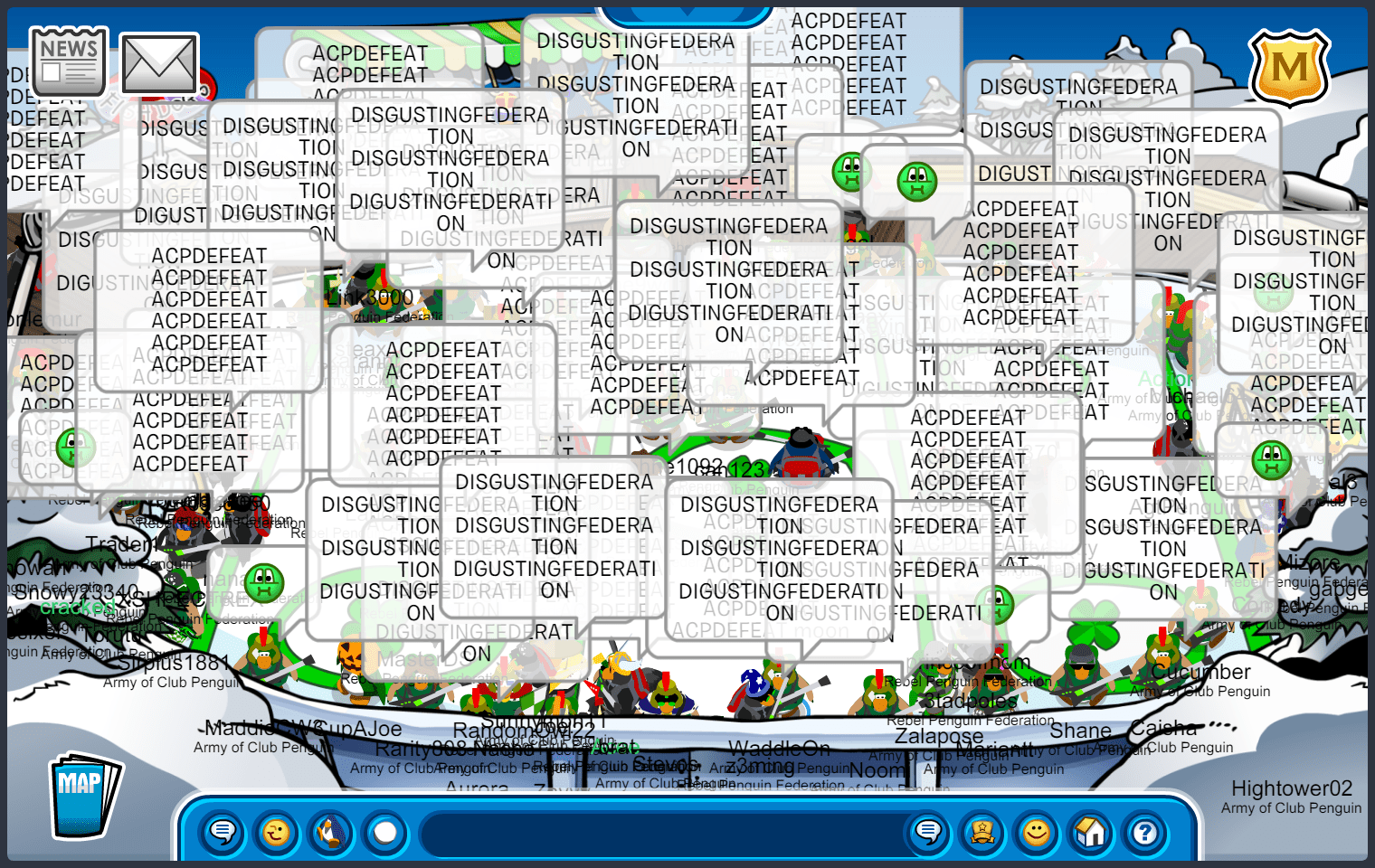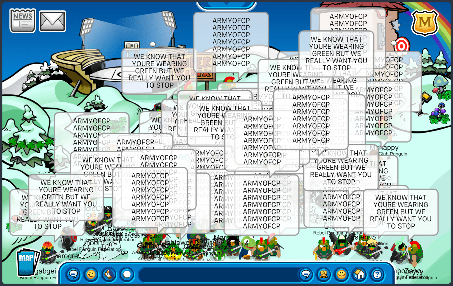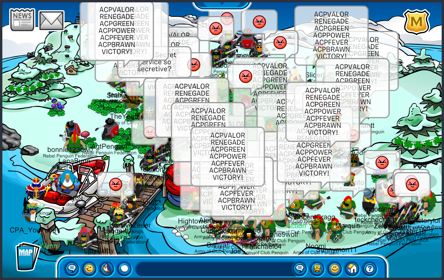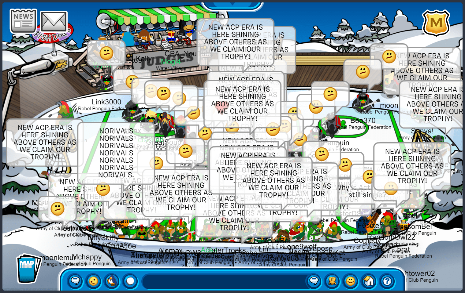 We met in Town, quickly maxing 55, before moving to the first room of the battle. The first room was docks, where we immediately started bombing “ARMYOFCP”. We then quickly went into an upside-down V formation, doing E2 emotes. As RPF was in the same form, we moved into a V doing ES emotes, starting another word tactic, “ACPVALOR RENEGADE ACPGREEN ACPPOWER ACPFEVER ACPBRAWN VICTORY!” and quickly moving to ED, suns. After a while, RPF moved into an upside-down T after waterfalling, we soon followed with a “DOMINATE” waterfall, moving into an upside-down V doing EP, puffles. We did an “UNDERDOGS” tactic, when RPF decided to bomb the room, we quickly moved to EZ, pizzas, before RPF settled into a V formation. After a few more word and emote tactics, we started bombing “GREEN TOGETHER FAMILY FOREVER”, moving into an upside-down T, and RPF finished the room with a bomb. Although we did slightly better than RPF, and having a difference of 10+ penguins in the room, the judges decided to give this room to RPF.