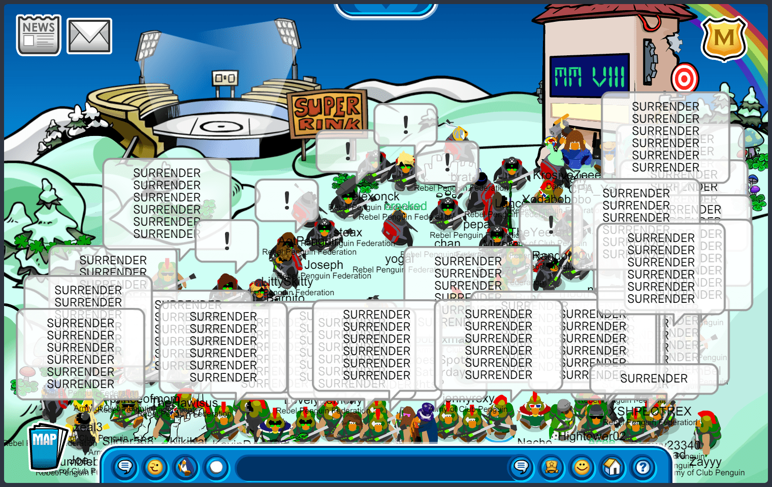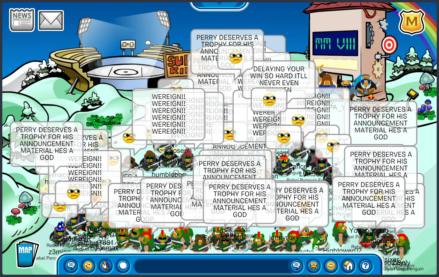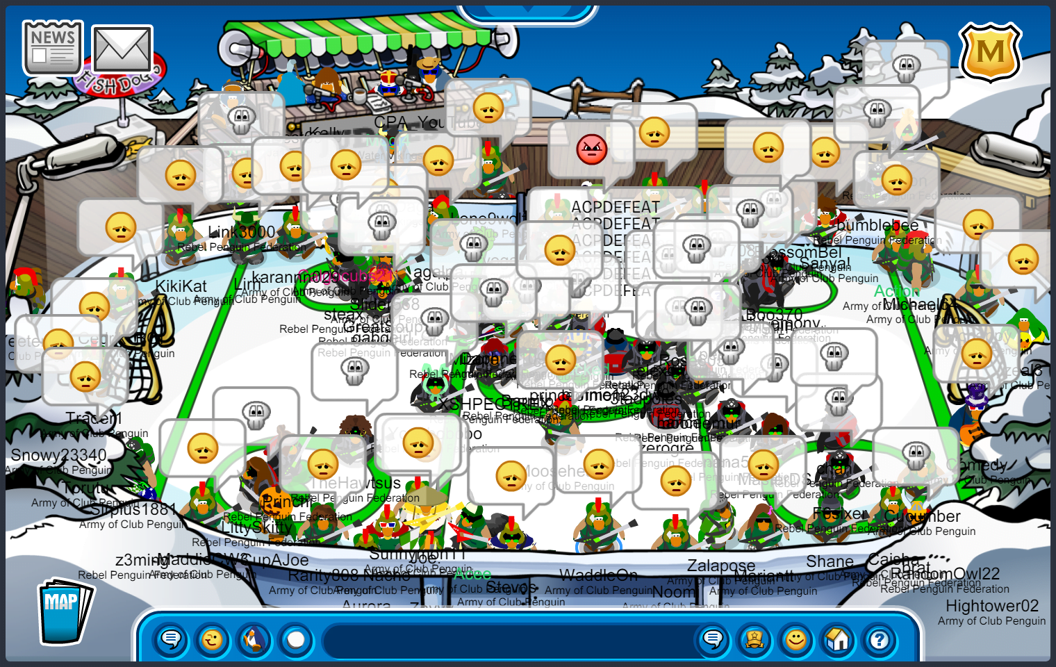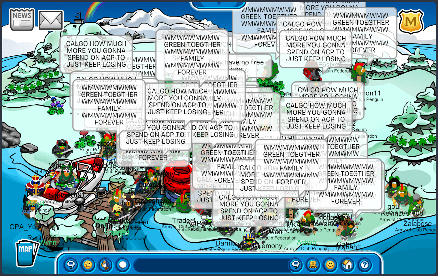 We met in Town, quickly maxing 55, before moving to the first room of the battle. The first room was docks, where we immediately started bombing “ARMYOFCP”. We then quickly went into an upside-down V formation, doing E2 emotes. As RPF was in the same form, we moved into a V doing ES emotes, starting another word tactic, “ACPVALOR RENEGADE ACPGREEN ACPPOWER ACPFEVER ACPBRAWN VICTORY!” and quickly moving to ED, suns. After a while, RPF moved into an upside-down T after waterfalling, we soon followed with a “DOMINATE” waterfall, moving into an upside-down V doing EP, puffles. We did an “UNDERDOGS” tactic, when RPF decided to bomb the room, we quickly moved to EZ, pizzas, before RPF settled into a V formation. After a few more word and emote tactics, we started bombing “GREEN TOGETHER FAMILY FOREVER”, moving into an upside-down T, and RPF finished the room with a bomb. Although we did slightly better than RPF, and having a difference of 10+ penguins in the room, the judges decided to give this room to RPF.