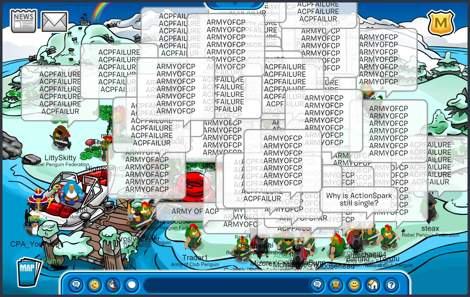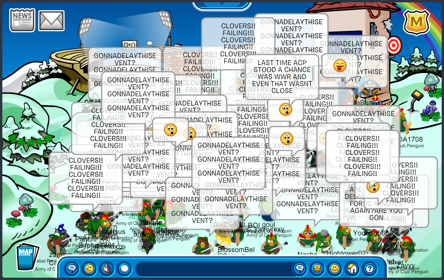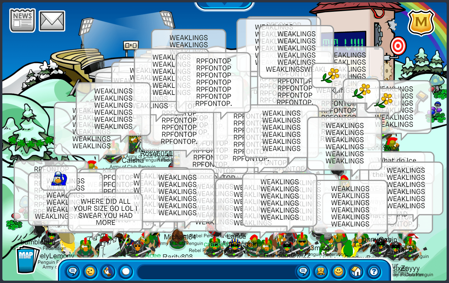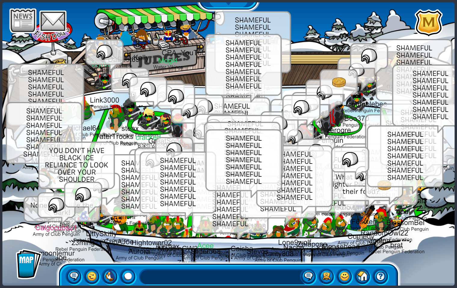 We met in Town, quickly maxing 55, before moving to the first room of the battle. The first room was docks, where we immediately started bombing “ARMYOFCP”. We then quickly went into an upside-down V formation, doing E2 emotes. As RPF was in the same form, we moved into a V doing ES emotes, starting another word tactic, “ACPVALOR RENEGADE ACPGREEN ACPPOWER ACPFEVER ACPBRAWN VICTORY!” and quickly moving to ED, suns. After a while, RPF moved into an upside-down T after waterfalling, we soon followed with a “DOMINATE” waterfall, moving into an upside-down V doing EP, puffles. We did an “UNDERDOGS” tactic, when RPF decided to bomb the room, we quickly moved to EZ, pizzas, before RPF settled into a V formation. After a few more word and emote tactics, we started bombing “GREEN TOGETHER FAMILY FOREVER”, moving into an upside-down T, and RPF finished the room with a bomb. Although we did slightly better than RPF, and having a difference of 10+ penguins in the room, the judges decided to give this room to RPF.