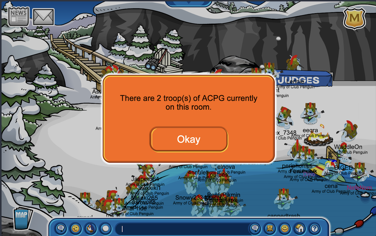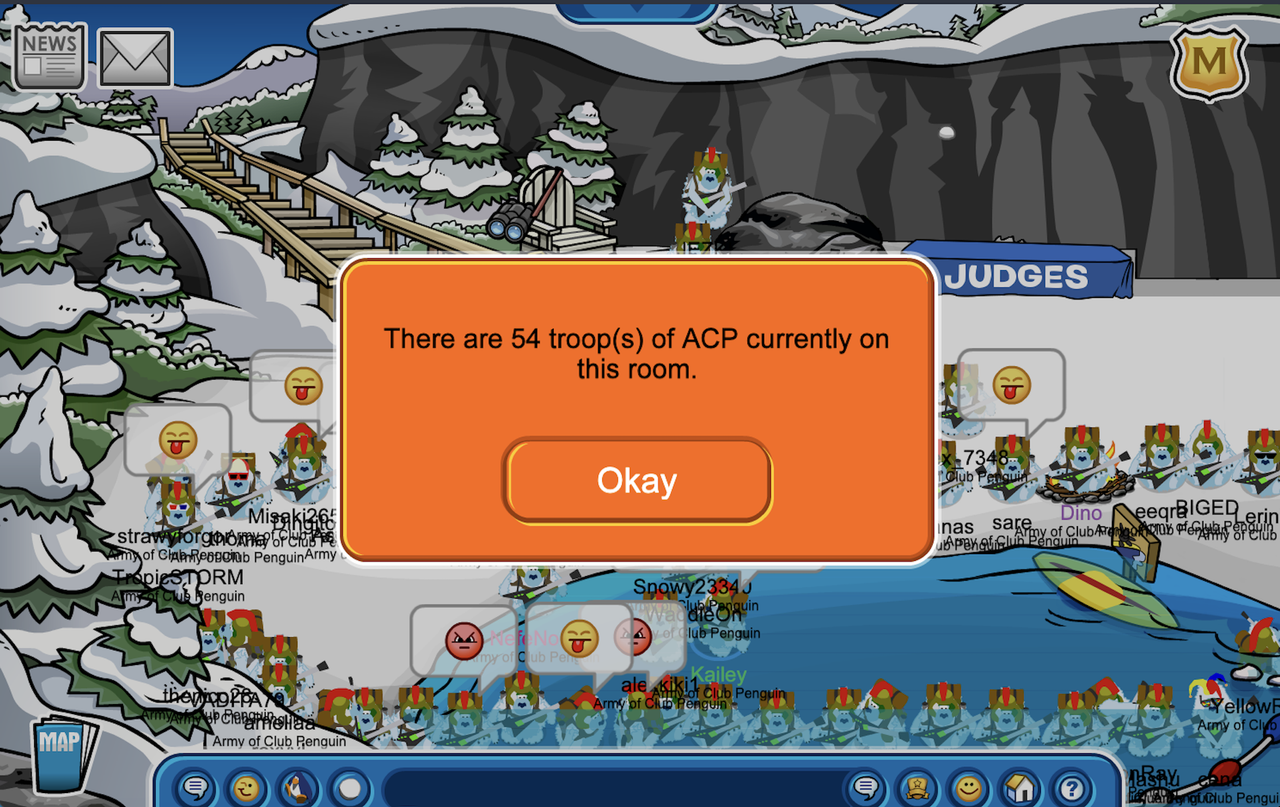 A lovely day, ACP, isn’t it? This week the Army of Club Penguin needed you and you responded like a LOYAL troop! On January 24th, we joined Yeti on Club Penguin Battleground to celebrate everything we achieved lately during the Siege of Rhodes all THANKS TO YOU! We began at the Cove wearing our uniforms but with some yeti flare- very fitting with the server name. After a series of formations we were led by Daniel through the Forest, Plaza, Snowforts, and Town unleashing incredible formations along the way. We then hugged the coastline through Docks, Beach, and continued along Yeti territory. For our grand finale, we headed through Ski Village and climbed to the top of the island at the Ski Hill where we sang “Happy Birthday” to QueenKay. We then began our races where troops had to run to each room- with the first person entering receiving clovers. Congratulations to those speedy penguins who won! After our epic march, the event came to an end deep within the Mine where we celebrated our victory one last time and gave medals to our troops for all the hard work.