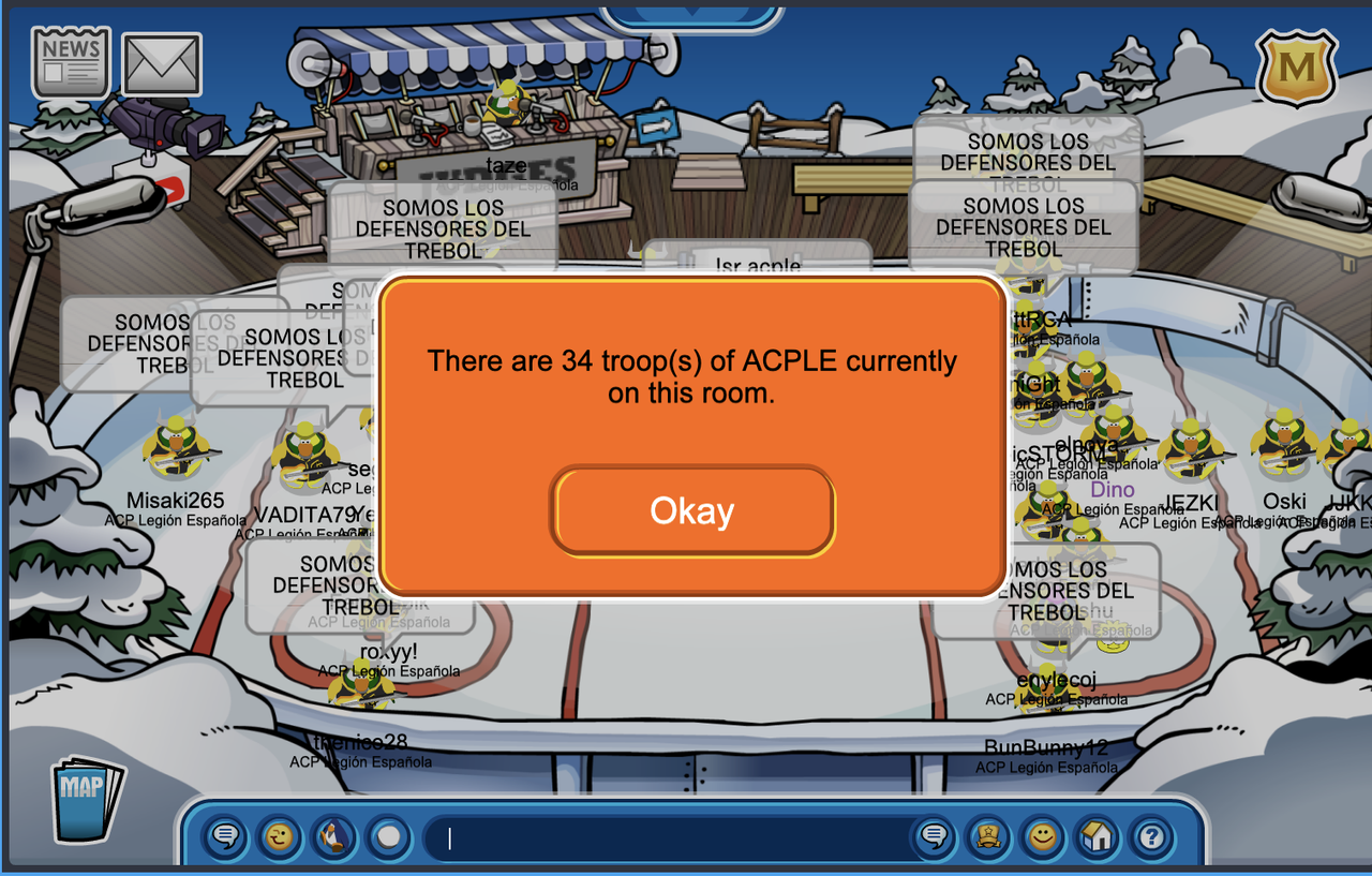 ¡Hola ACP! On January 28th, we logged onto Club Penguin Battleground to the Abdominable (Abominable) server to celebrate our Legión Española. We met up in the Iceberg dressed in a brand new uniform designed by Facu! We then started with a couple different formations and emotes before going to the Stadium. There we sent tactics like “USTED HA SIDO CUBIERTO POR LA LEGION ESPANOLA, SALUDOS!” along with more emotes! We then went to the Casa Fiesta forming a Z formation and sending more emotes and phrases in Spanish. We practiced sending more tactics before attempting a sun formation that we then rotated in a clockwise rotation and a couple troops raked in the middle of the sun. We also attempted to create a formation based on the Legión Española logo. Finally, we went to the Mine forming an arrow and a diamond from Minecraft. ]