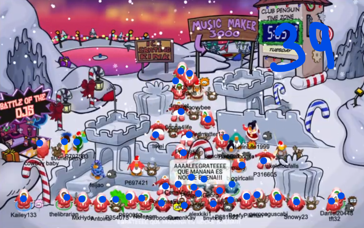 Happy Holidays, ACP! On December 27, the UK Clover Santas made a late stop onto Club Penguin Journey to deliver some overlooked presents. After logging in to Sleet, the Santas met up at the Mine to gather all of the presents. After they managed to sort out everything amongst themselves they began their deliveries. In the middle of our flights we made a stop at the DMV to renew our flying licenses. Despite the delay, we are happy to report that the Clover Santas successfully delivered presents to 25 igloos! At the end of the night 8 Santas received promotions, congratulations!