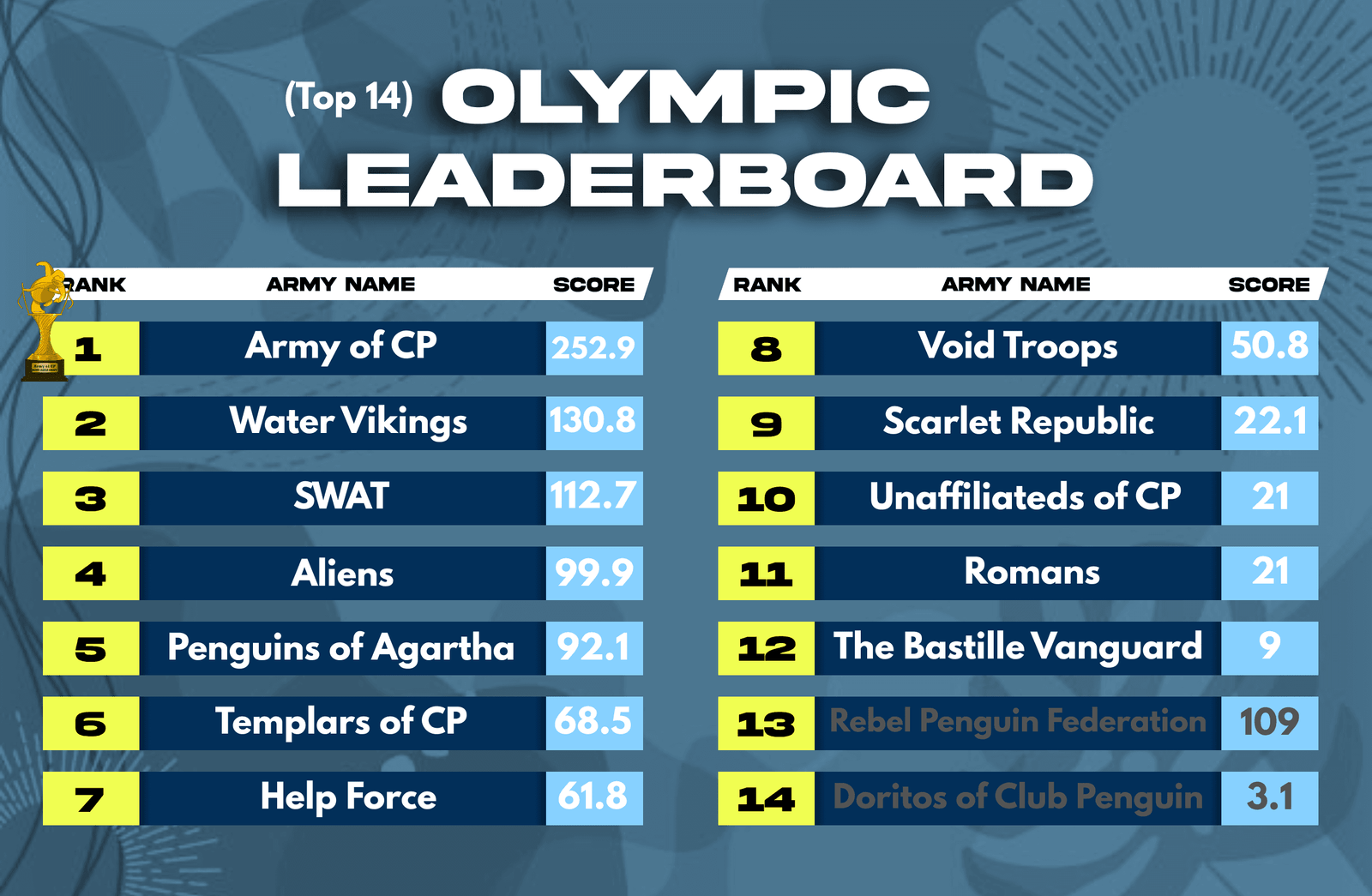 • Welcome to the official Army of Club Penguin! Established September 29th, 2006, we have been the largest and best Club Penguin community since. Enlist today and start your journey!